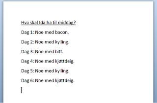 Så nå driver jeg og skriver handleliste siden jeg må opp på Rema for å handle inn middager og ymse til de neste 6 dagene.